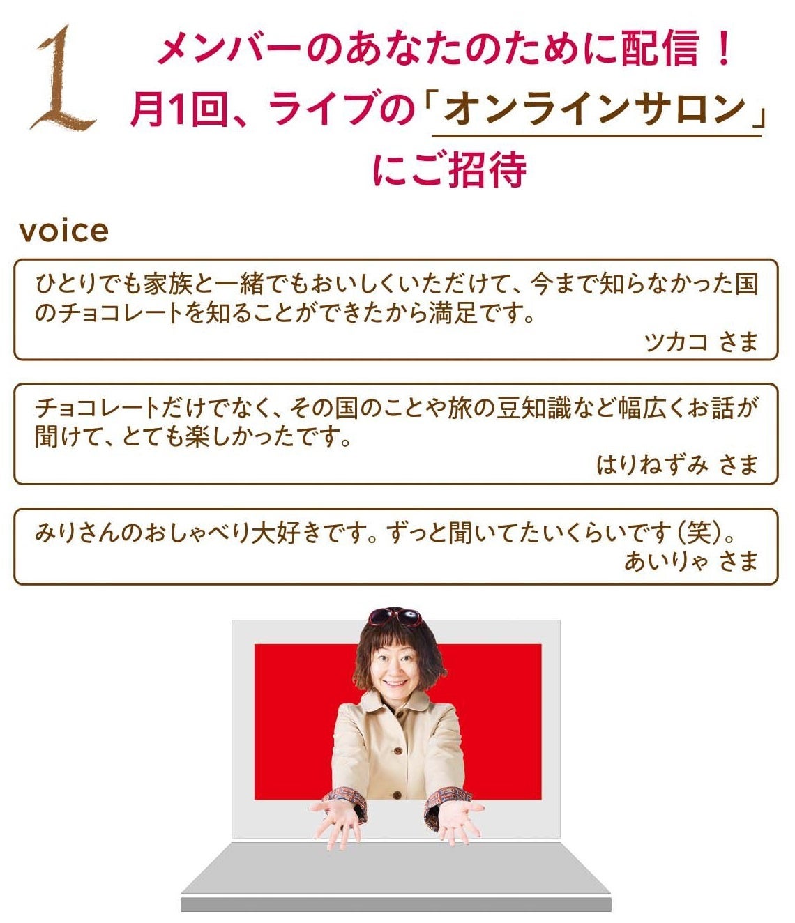 1.毎月届くチョコの特長、ショコラティエとの出会いやエピソード、飲み物のペアリングなどチョコレートバイヤー みりの楽しいトークを視聴できます。