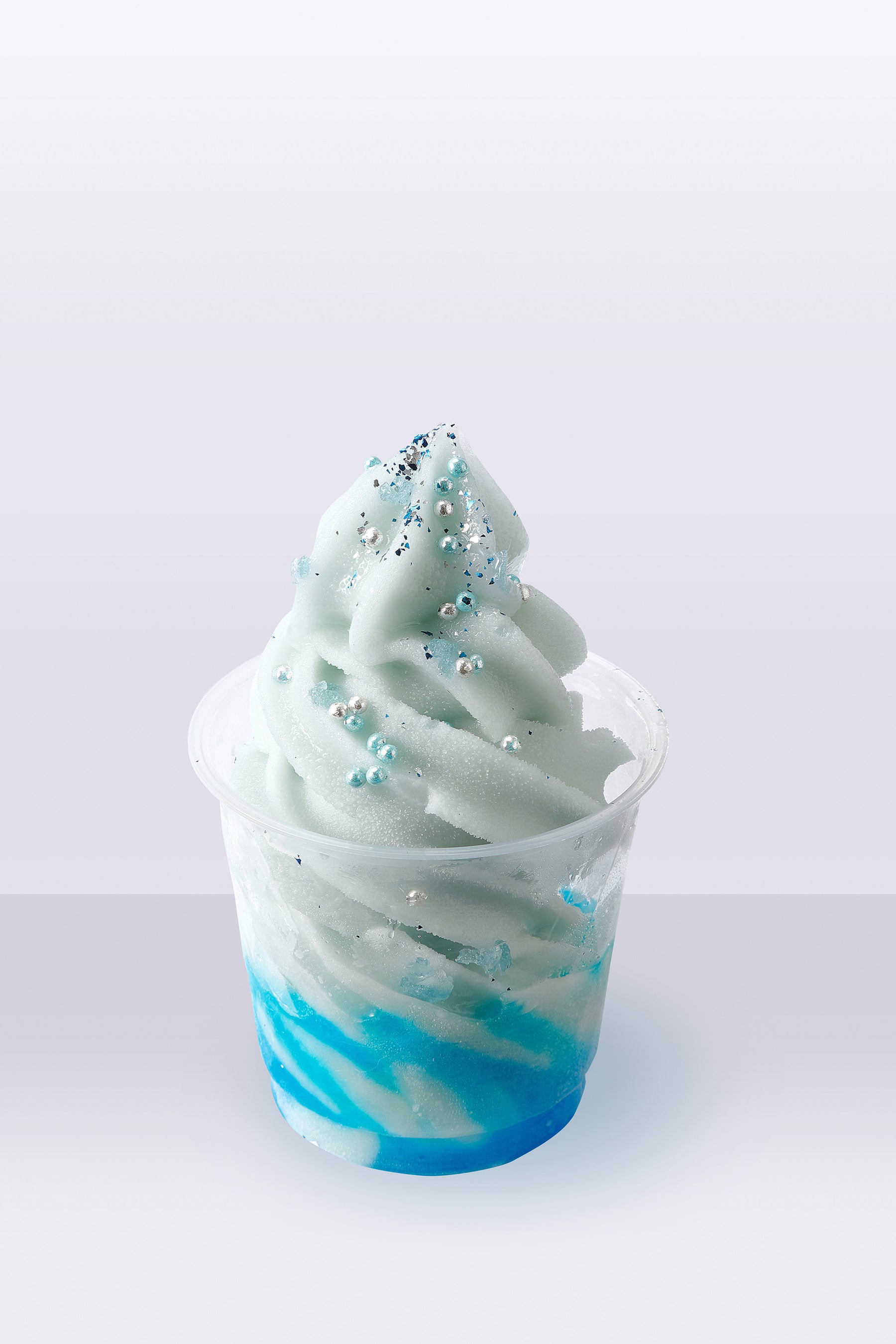 海を漂う氷山を模した淡いブルーのラムネ味ソフトクリームに、シルバーとブルー、2色のアラザンと、パチパチキャンディーをトッピング。