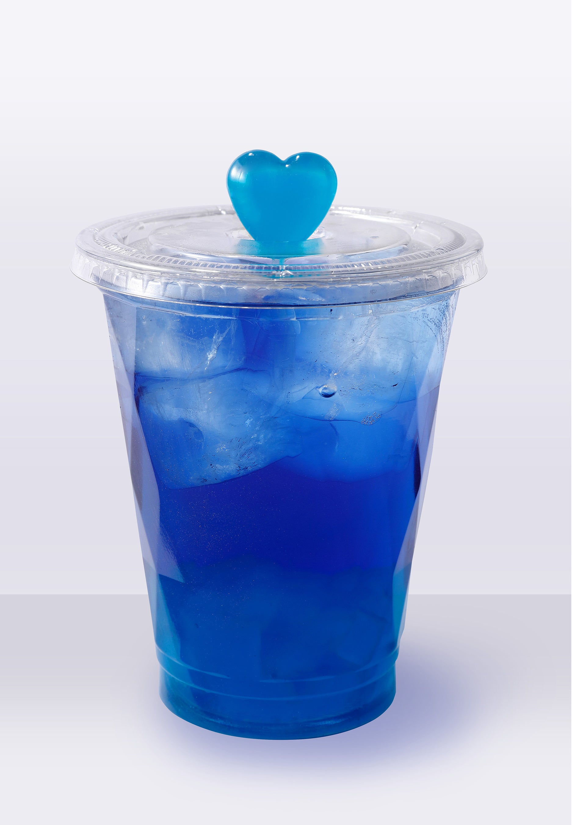 ブルーのハート型シロップを混ぜると、見た目は鮮やかなパープルに変わり、味も変化するため、2度楽しめるドリンクです。