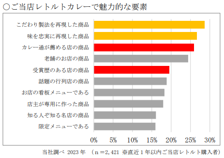 ご当店レトルトカレーにおいては、「カレー通が薦める店の商品」や「受賞歴のある店の商品」などに 対するお客様の興味関心が高くなっています。
