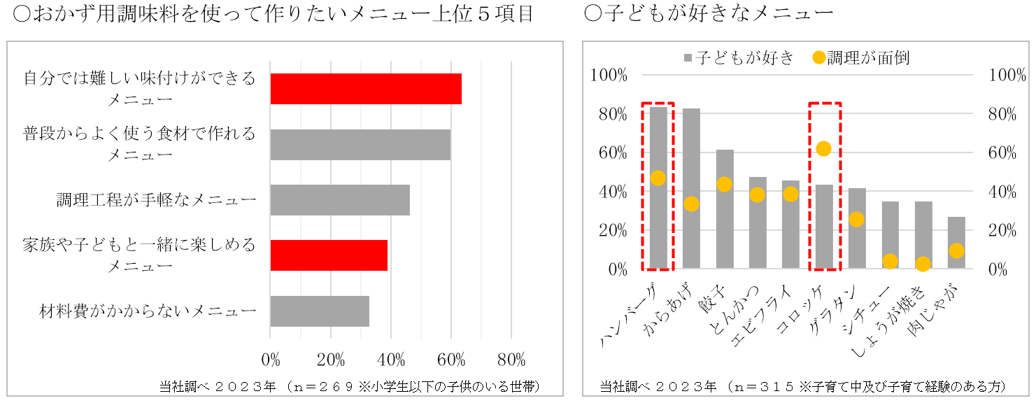 おかず用調味料に対しては、簡便さだけでなく、特別感のある味付けや家族で楽しめるメニューが求められています。一方で、子どもに人気のハンバーグやコロッケは、調理負担を感じるメニューとなっています。