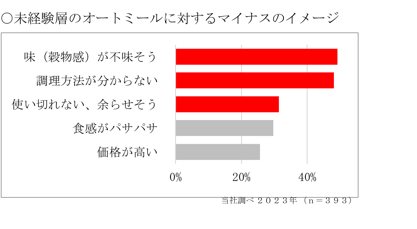 オートミールを食べたことがない方は、オートミールの「特有の味わい・食感」や「調理方法がわからない」「使い切れない量」といった点に不満・不安を感じています。