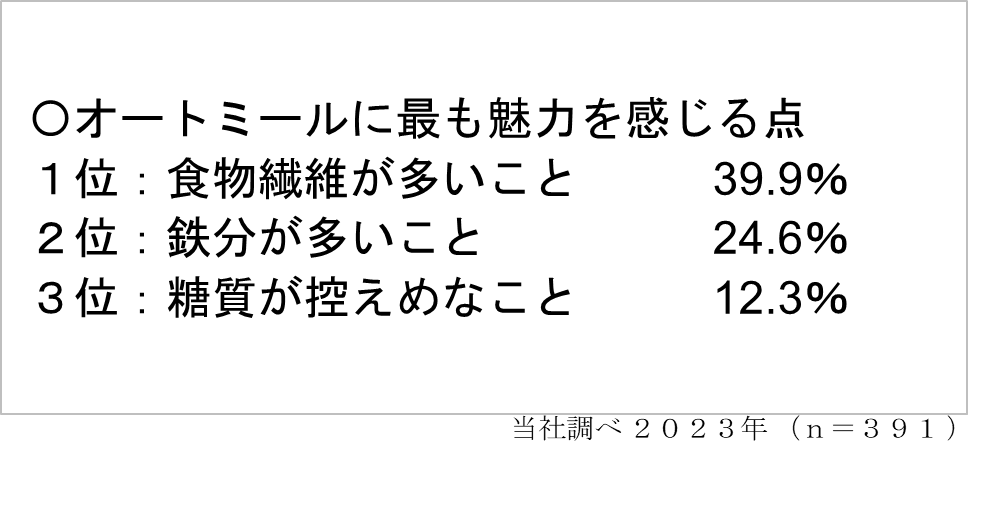 健康志向が高まる中で、オートミールに対しては、「食物繊維」「鉄分」「糖質が控えめ」といった点に魅力を感じている方が多くなっています。