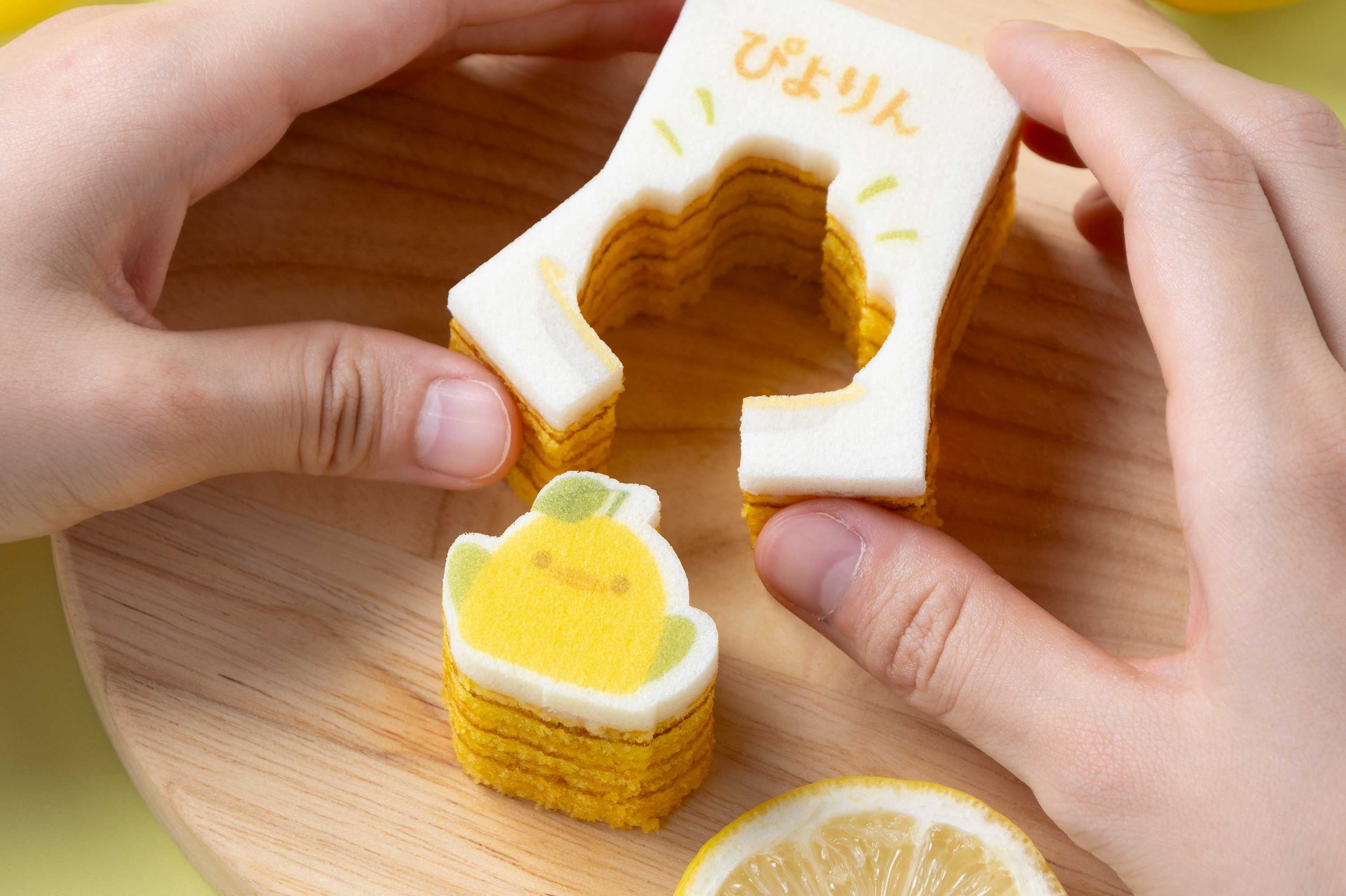 ご好評いただいているプレーン味のぴよりんかたぬきバウムに続いて、新しく「ぴよりんかたぬきバウム(レモン)」ができました。レモンのさわやかな酸味と甘みのバランスが絶妙で、暑い季節にもぴったりな味わい。きれいなレモン色のバウムにメレンゲ仕立ての真っ白生地を重ねて、かわいいぴよりんを描きました。ぴよりんを縁取るようにカットラインがはいっているので、そっとまわりの生地をはずすと型ぬきができます。ぴよりんのかわいさとおいしさの間に「型ぬきする楽しさ」を加えた、体験のあるお菓子です。