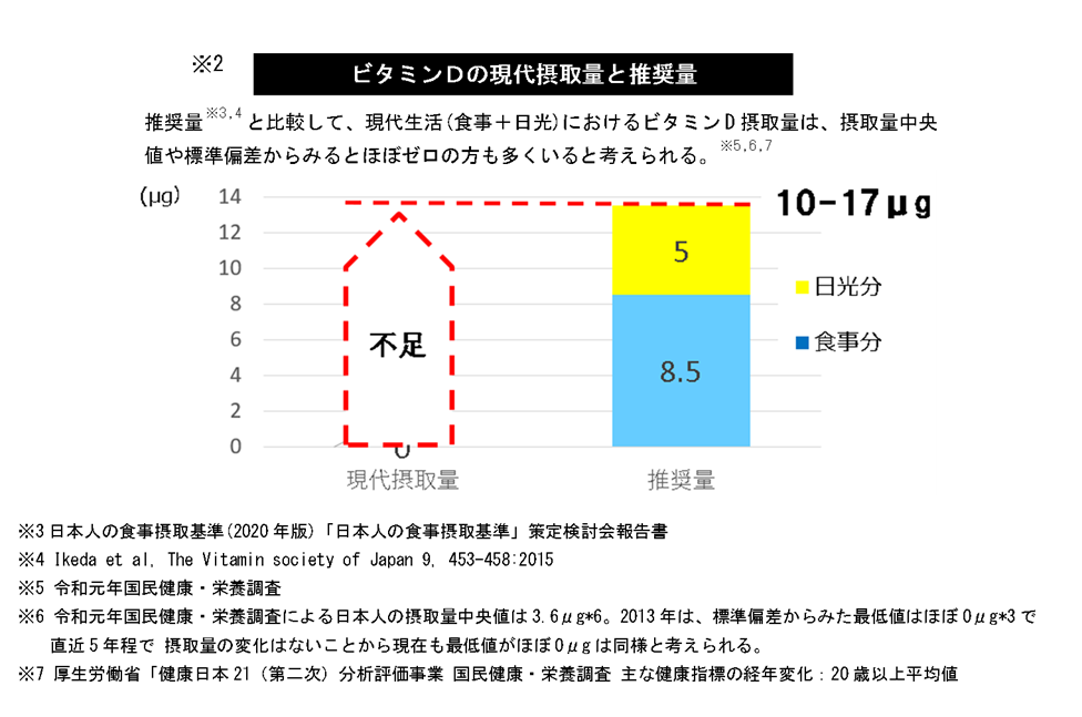また、同様に現代の日本人にとって摂取量が不足しているビタミンD※2は、別名「太陽のビタミン」と呼ばれ、食事から摂取されると共に、日光に当たることで体内にて合成され、健康のために必要な栄養素です。