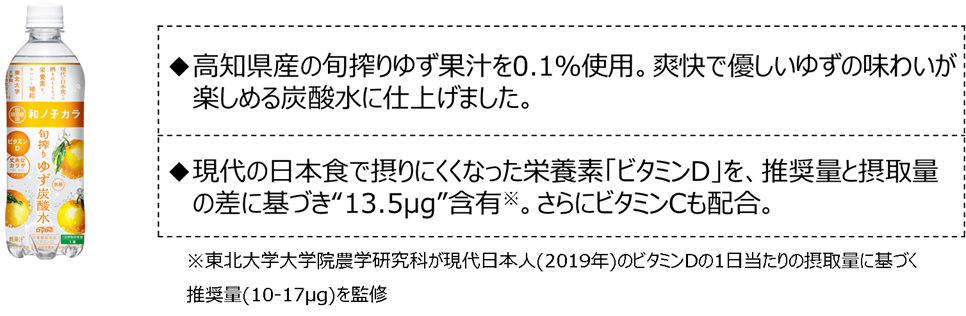 そこで今回、東北大学大学院農学研究科が栄養素の摂取量と推奨量を監修し、幅広く飲用されている無糖炭酸水をベースに、ビタミンDを補給できる「和ノチカラ 旬搾りゆず炭酸水」を新発売いたします。