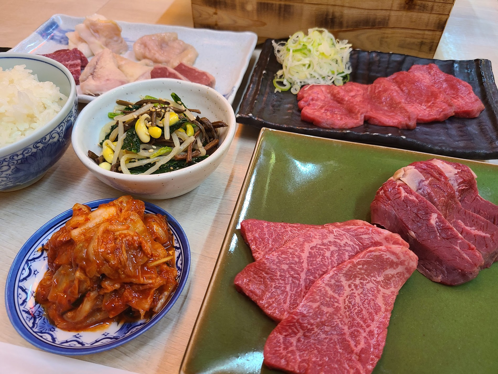 上ハラミと上ロースの贅沢な味わい、ネキたんの繊細な風味、さらには5種類のホルモンの濃厚な旨みが楽しめます。キムチやナムルのピリ辛さがアクセントとなり、お腹いっぱい満足感を与えるセットです。