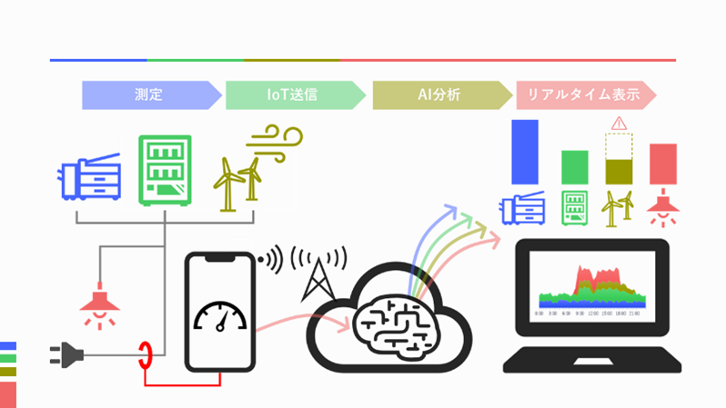 エナジーカラリングは、電流を音としてスマートフォンで測定し、クラウドAI によって電力の用途内訳をリアルタイム(最大1分値1分遅れ)で可視化する商工業分野向けAI・IoTを活用したスマート電流計「EnergyColoring」の開発・運営を行い、脱炭素社会の実現には欠かすことのできない電力可視化を身近にするイノベーションを起こす社会貢献志向の技術者集団です。