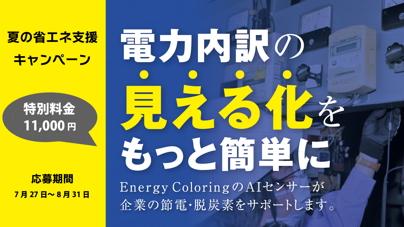 商工業分野向けAI/IoT電流計「EnergyColoring」は、センサーは、1つ1つの設備にセンサーを設置することやデータを回収する手間が省けることに加えて、設置直後からデータを確認することができるため、スピーディーに現状を把握することができます。工場・公共施設などでご利用いただき、電力内訳を見える化したことで省エネにつながった実績もあります。この度、夏季の省エネキャンペーンとしてより多くの企業様にサービスを利用していただけるように特別料金でご提供いたします。