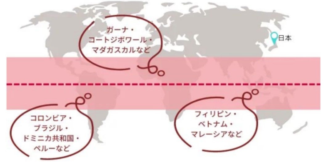 カカオの栽培に適した地域は「カカオベルト」と呼ばれ、赤道からの上下20度以上に集中しているんです。