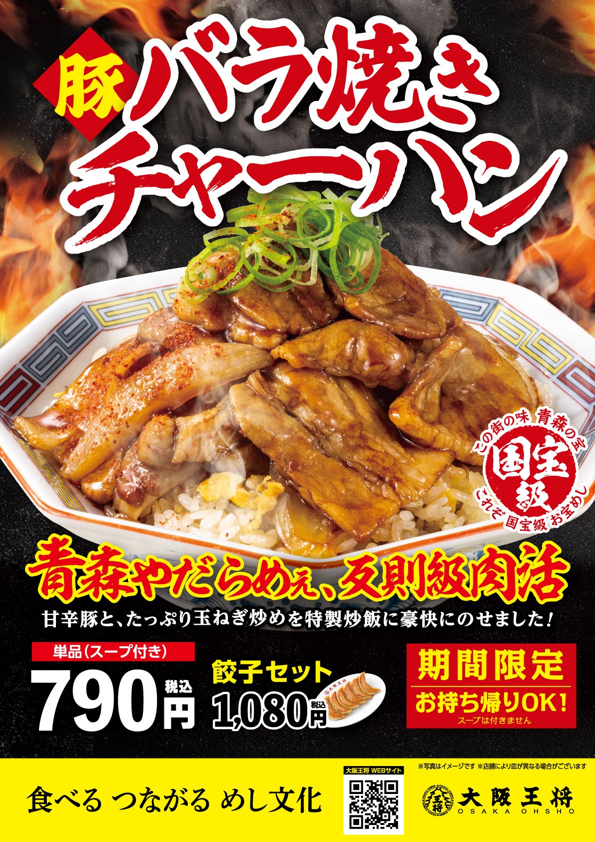 たっぷりの玉ねぎとバラ肉を、醤油ベースの甘辛いタレに絡めてしっかりと炒めた“バラ焼き”。青森三沢生まれ・十和田育ちのB級グルメを、このたび大阪王将・国宝級お宝めとして3店舗限定・期間限定で発売いたします。ご当地では、ご飯が進む“鉄板”料理として愛されていますが、今回大阪王将では、ニンニクをきかせたガッツリチャーハンの上に豚肉の“バラ焼き”をオン。豪快にお楽しみいただける一品としてご紹介いたします。