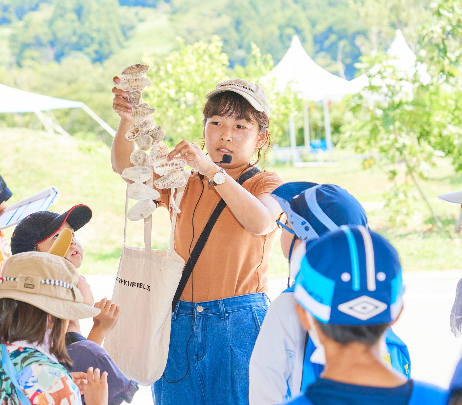 農場内で出る野菜クズや牛糞から作られる堆肥を使って育てられた野菜の収穫体験を行いました。また、近隣の海で海苔の養殖に使われ、その後破棄されていた蠣の殻についても、農場では貴重なカルシウム源ということで、場内で飼育する鶏のエサや肥料として利用。これまで破棄されていた殻まで、全てを活用するというお話から、施設内だけでなく地域全体で資源が循環し、生き物や野菜を育てる仕組みを学びました。
