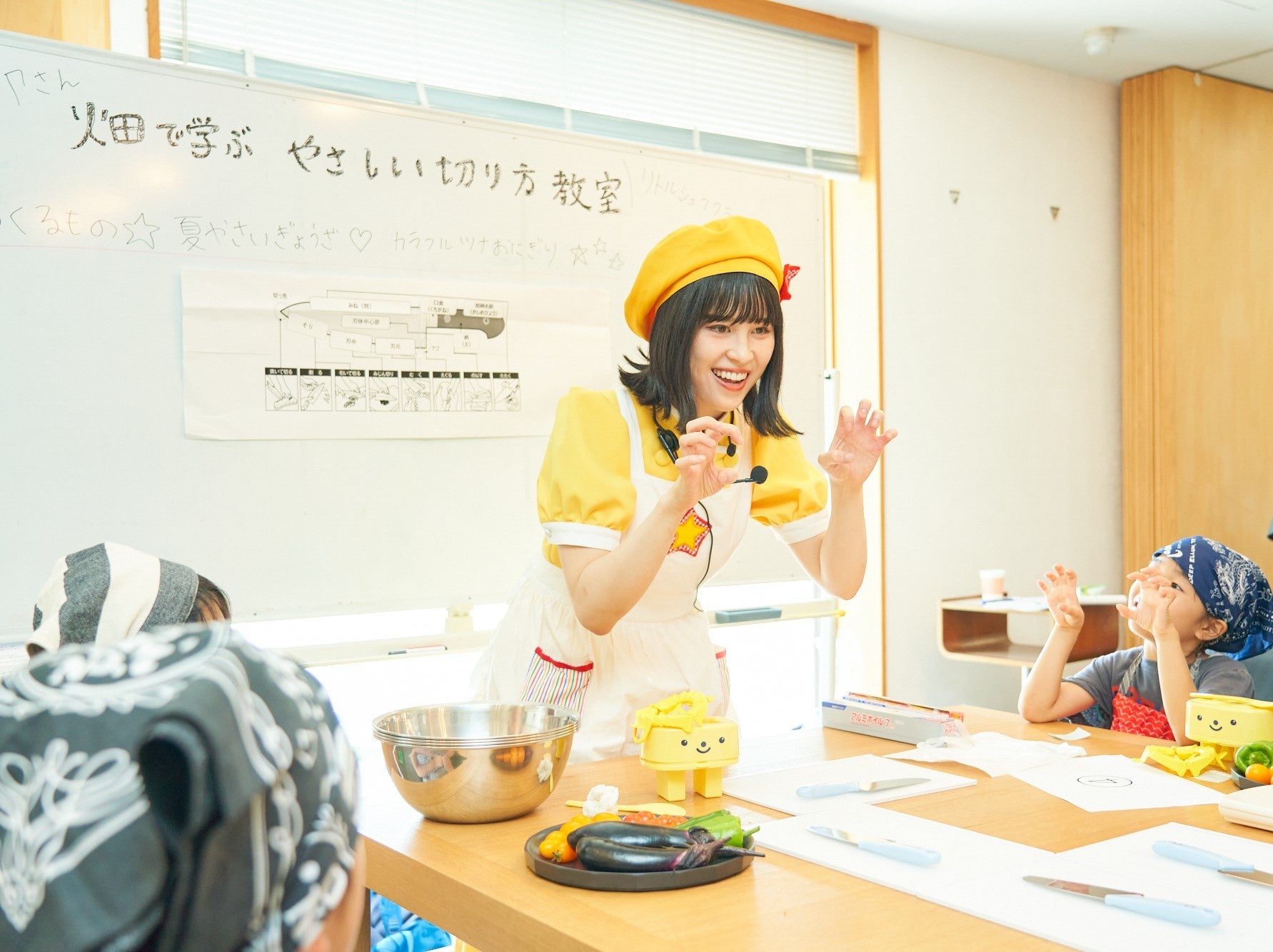 その後場内の畑で野菜を収穫。種類の異なるミニトマトの食べ比べをしたり、収穫の際手に残ったバジルの香りをかいだりしながら、畑での収穫を楽しみました。キッチンへ移動した子供たちへはリトルシェフクラブの包丁がプレゼントされ、そこで包丁のパーツごとの名前や、正しい持ち方、切り方を学び、自分たちで収穫した野菜を過剰除去の少ない切り方で調理しました。切った野菜は餃子とおにぎりの具材として使用され、リトルシェフクラブで新発売された「とびだすおにぎり型」と「はさんでできるぎょうざ型」を用いて親子で一緒に調理し、みんなでおいしくいただきました。