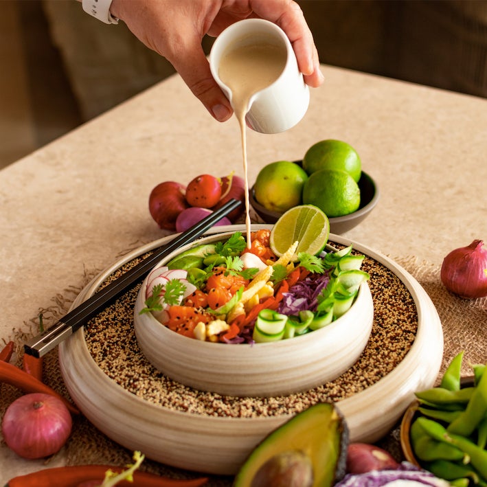 55キッチンでは、夏野菜を美味しく食べてもらいたいと、ドレッシングを豊富に取り揃え、ドレッシングをお買い求めのお客様に韓国で注目のAUNO GRANOをプレゼントしています。