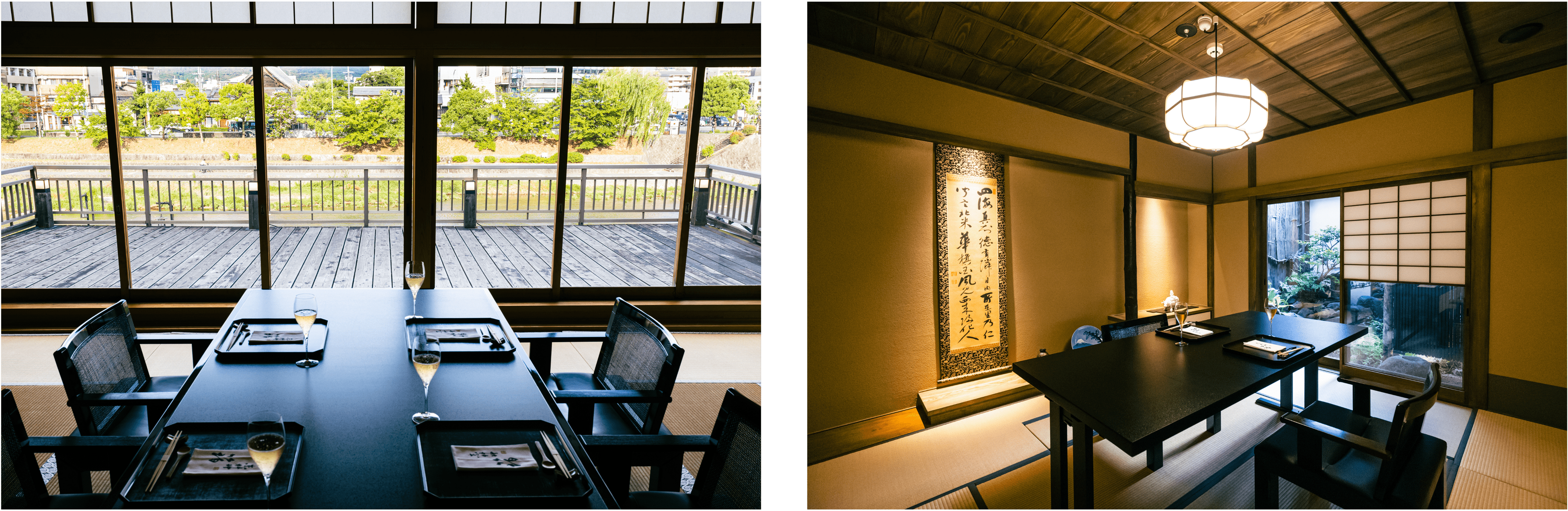 【お部屋】京料理 箔は全席個室でご案内しております。京阪・三条駅より徒歩5分の駅チカでありながら一歩足を踏み入れるとゆったりと時間が流れる異空間。鴨川を望むお部屋や、世界的なガーデンデザイナー石原和幸氏が手がけたお庭を眺めることができるお部屋をご用意しております。