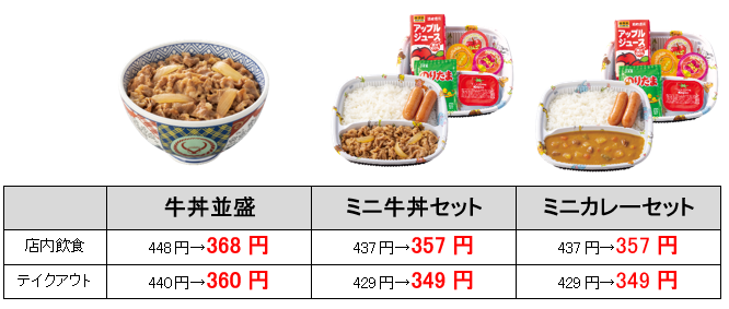 対象商品は「牛丼」をはじめ丼・皿・カレー・定食メニュー60種類以上です。店内飲食の場合、来店した小学生以下のお子様を対象とし、「牛丼」並盛は通常税込価格が448円のところ税込価格368円の特別価格で、テイクアウトの場合はテイクアウト特別価格360円(通常税込価格は440円)でお子様の人数分提供します。テイクアウト利用時はお子様の来店、同伴の必要はありません。お子様の人数を会計時にお伝えください。