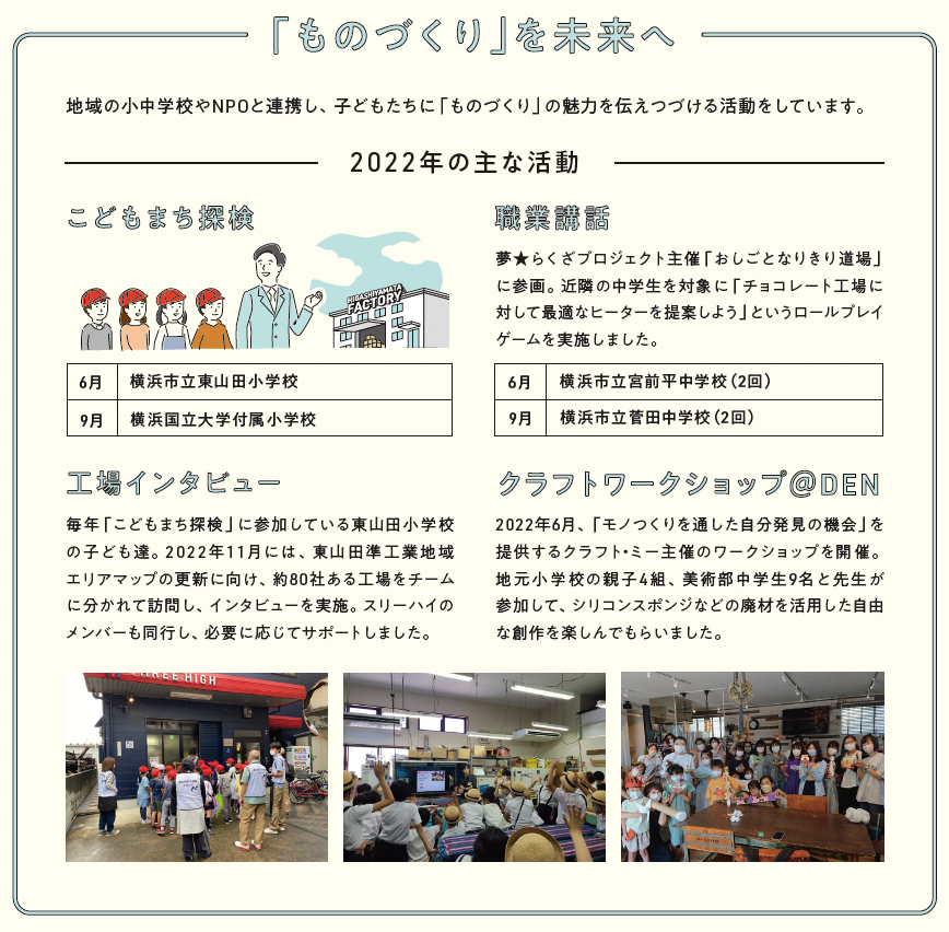 具体的には、スリーハイが立地する東山田地区の工場を紹介する「こどもまち探検」や「工場インタビュー」などです。これら地域活動の取り組みには、スリーハイの従業員が主体となって取り組んでいます。
