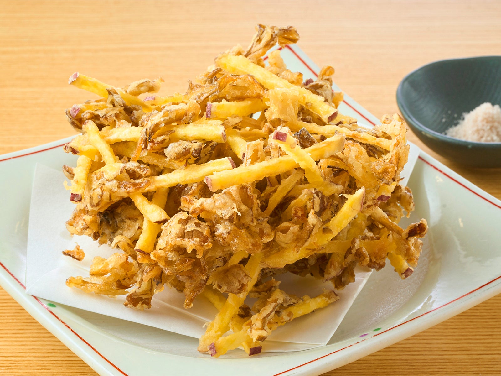 さつま芋の甘味と舞茸の食感がやみつきになるかき揚げ!藻塩とつけてどうぞ♪