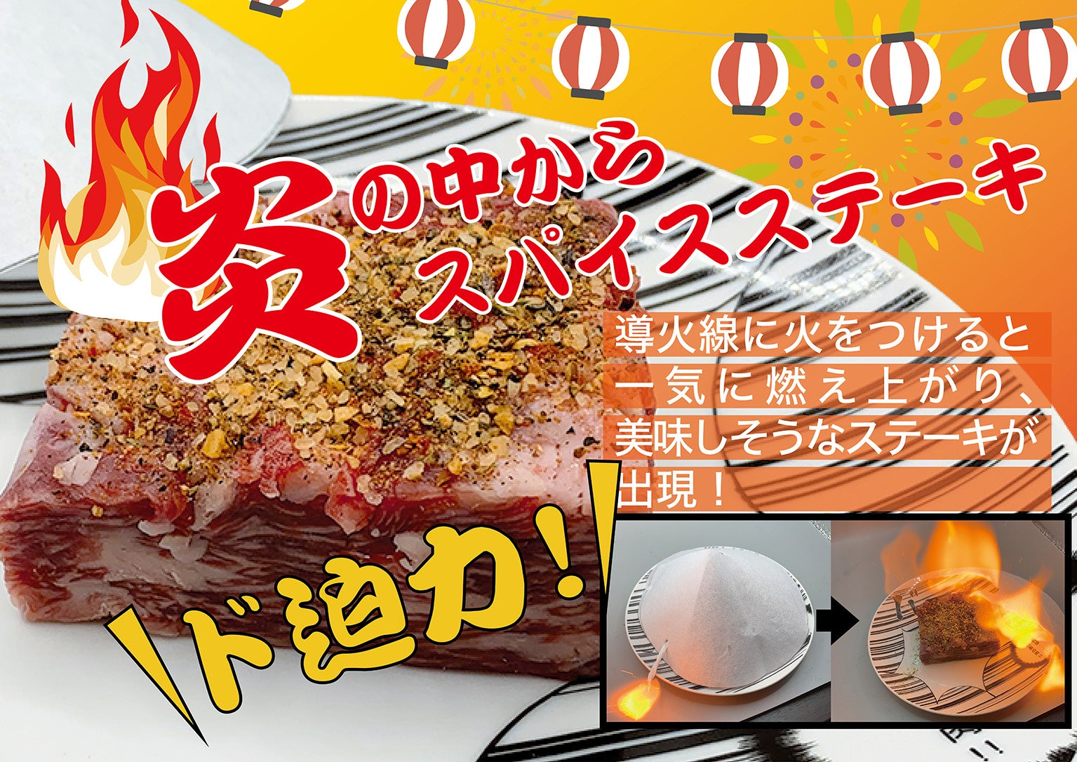 導火線に火をつけるとあら不思議!スパイスステーキの登場!まるでマジックを見ている気分に!