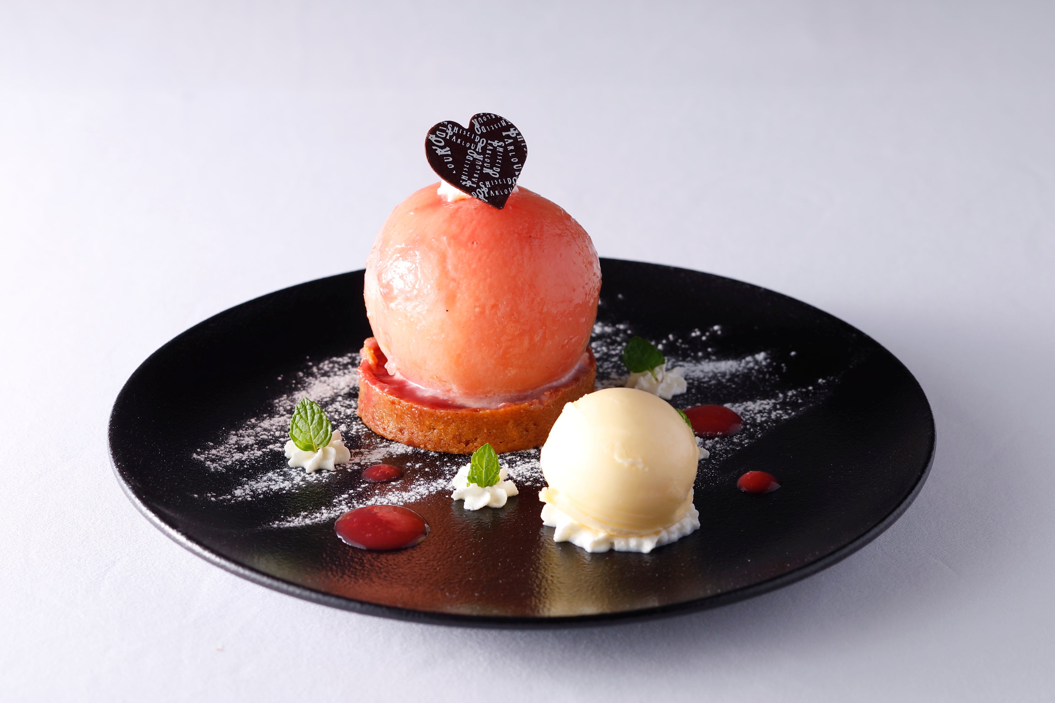 白桃丸ごと 1 つをタルト生地の上にのせて可愛らしく仕上げました。桃をそのまま楽しんでいただく「名古屋店」オリジナルのデザートです。種をとり、湯むきした桃の中にカスタードクリームとシャンティクリームを詰めました。 まわりに桃のソースとバニラアイスクリームを添えています。桃そのもののフレッシュ感をお楽しみください。