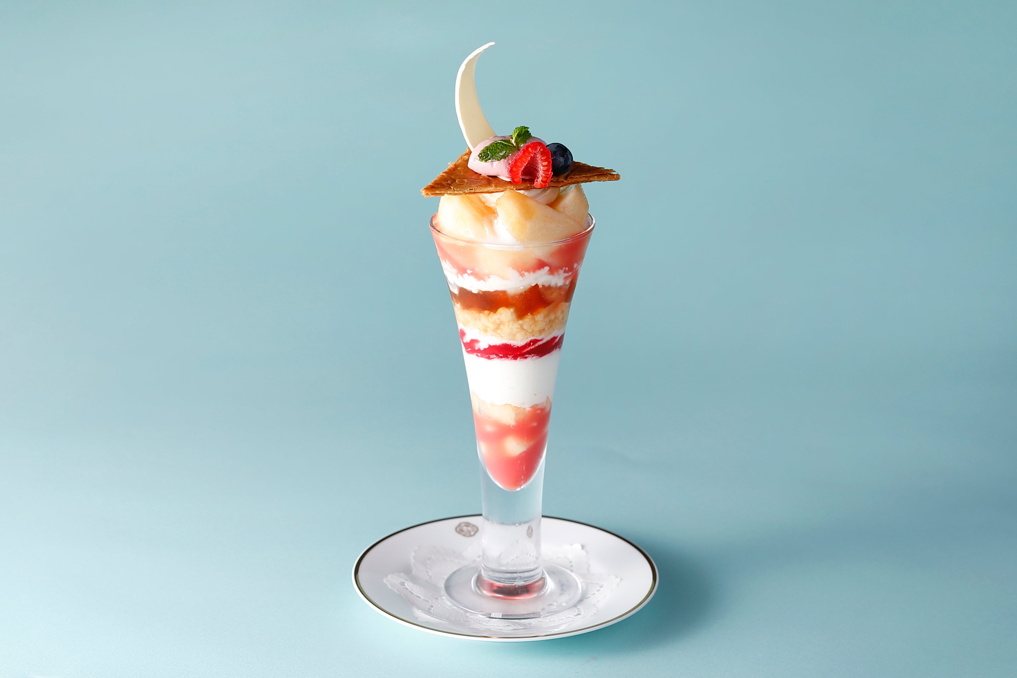 みずみずしく上品な甘味のある白桃を盛り付けた「自由が丘店」限定のオリジナルパフェ。 赤桃とグァバのソースをアクセントに加え、桃そのものの甘味とソースの酸味とのバランスを意識してパフェに仕立てました。パフェの中ほどには、桃と相性の良い紅茶のゼリーやアーモンドクッキーを砕いたクランブルを加えました。ミルクアイスクリームやシャンティとのまろやかなハーモニーや、それぞれの食感をお楽しみください。