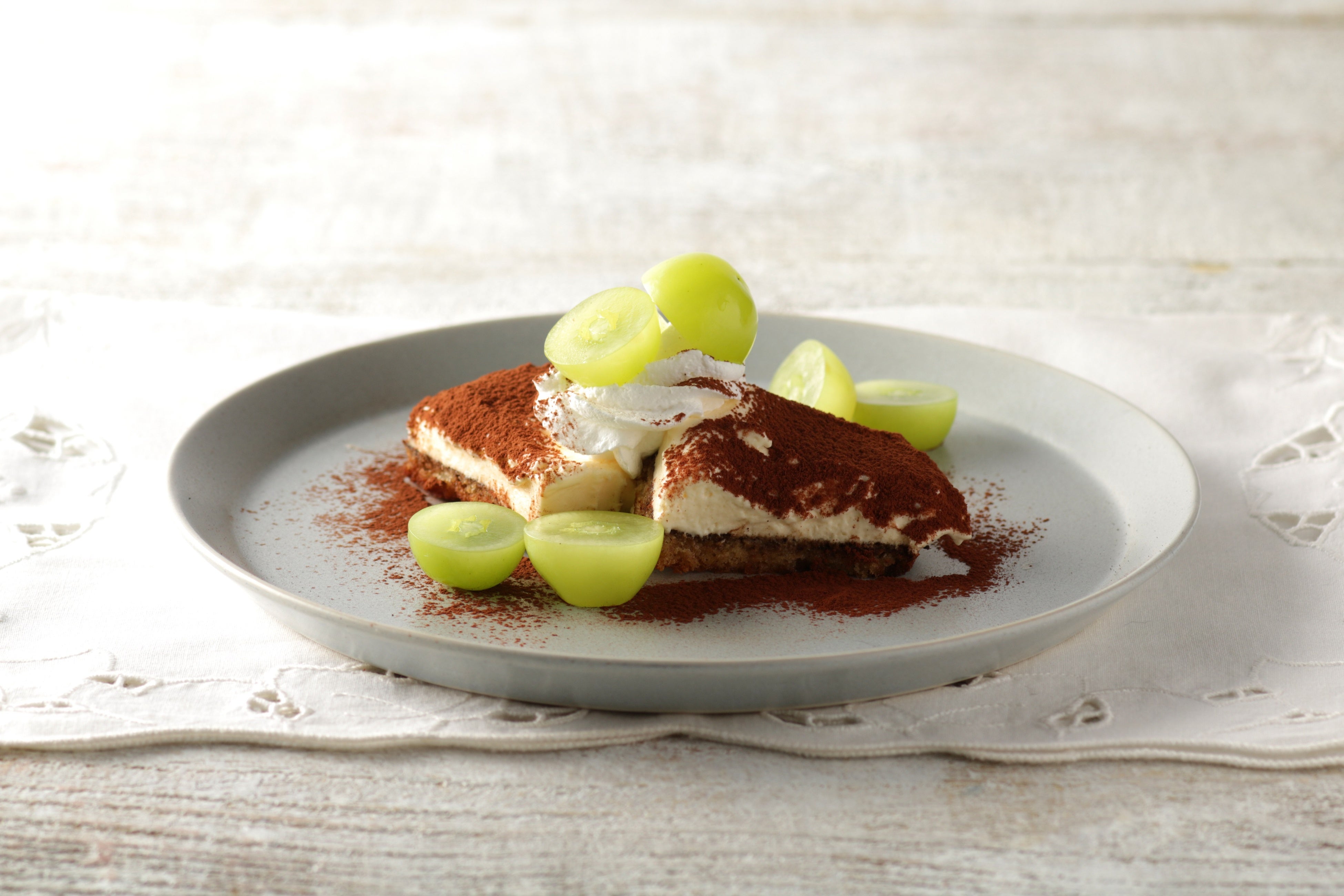 とろけるようなマスカルポーネ生地のティラミスにうきは産のみずみずしいシャインマスカットをあわせました。