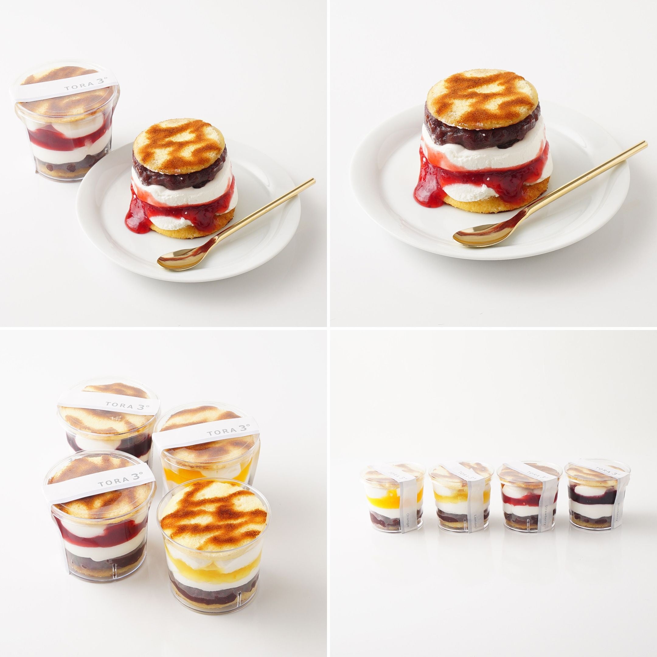 ストロベリー、ブルーベリー、オレンジ、レモンの4種のソースをご用意。3°で召し上がると絶品です。
