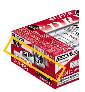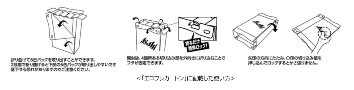 また、『アサヒスーパードライ エコパック』の本格展開に際して、「スーパードライ」ブランドで初めて「エコフレカートン」を採用しています。「エコフレカートン」は当社が開発した環境に配慮した外箱です。従来の外箱と比較し、開け口部分の紙の使用面積を3.8%削減しています。また、缶を取り出やすくするために、外箱にあらかじめ折り目をつけ、ふたを固定できるようにしています。さらに、店頭で商品を取り出して陳列することを想定し、開封時間の短縮や外箱を捨てる際にかさばらないよう工夫をしています。