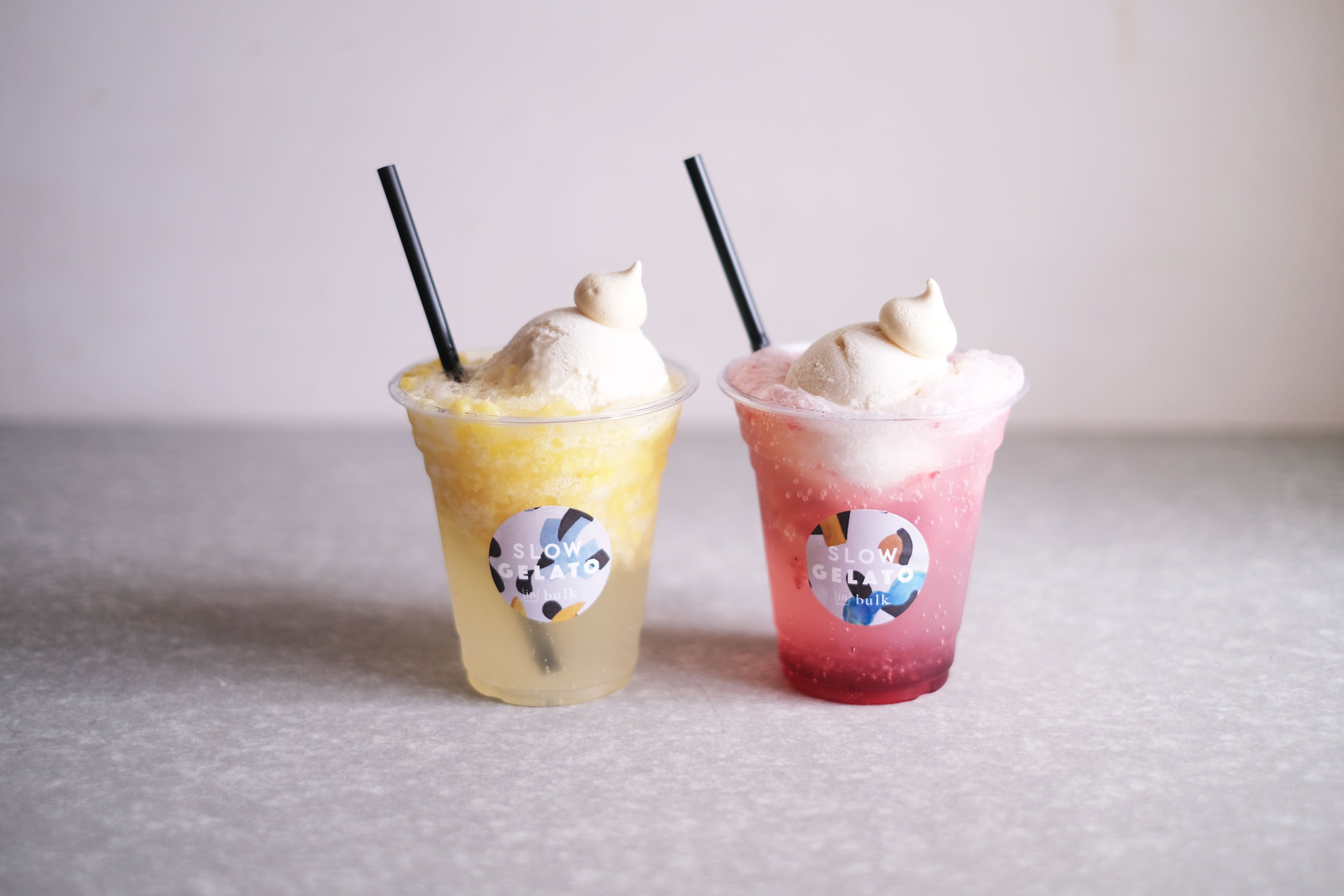 フローズンフルーツに、自家製ボタニカルシロップをブレンド。阿部牧場のASOMILKを使い、野々島学園(熊本)で障害のある人と一緒に作った濃厚ミルクジェラートをトッピングした贅沢なクリームソーダです。