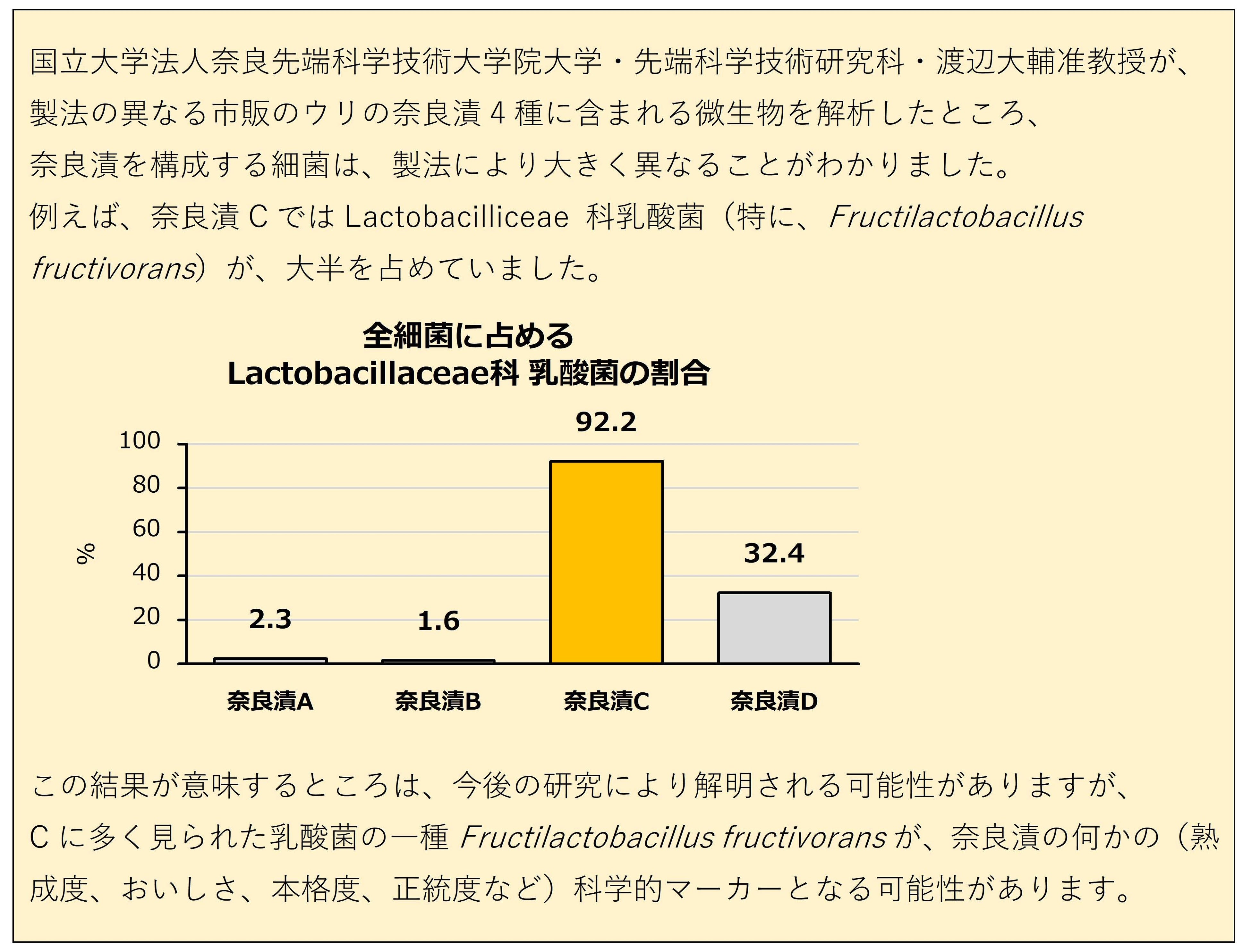 「今回の研究データによって、弊店の奈良漬は他社様の奈良漬と比較して、乳酸菌の量が圧倒的に多い事が判明しました。