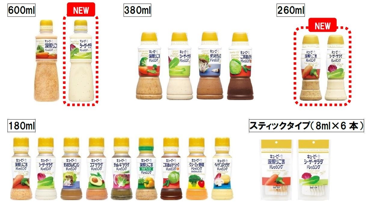 ドレッシング市場のボリュームゾーンである中容量帯(150~399ml)に対して、これまでキユーピーは180mlと380mlの2つの容量で展開してきました。世帯構成の変化や嗜好の多様化が進む中、あらゆる世帯や使用場面にフィットする容量ラインアップを目指し、主力の「深煎りごまドレッシング」と「シーザーサラダドレッシング」から新容量260mlを発売します。