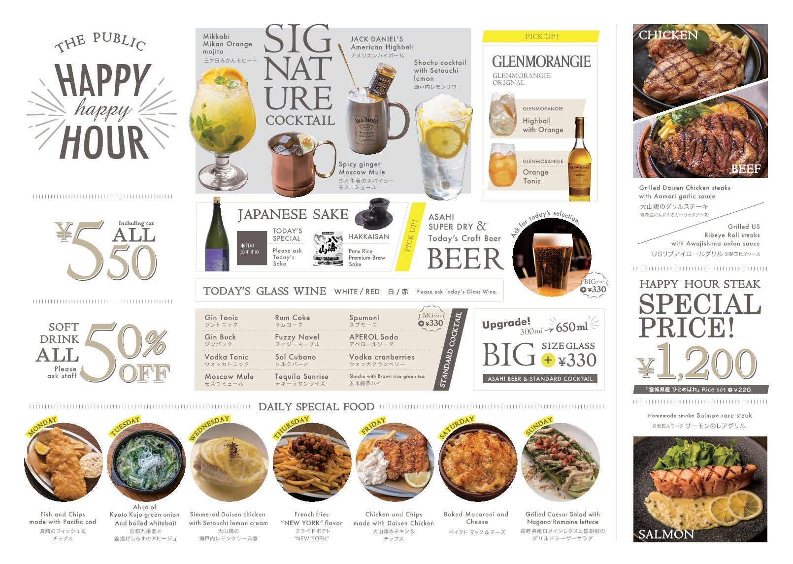 この日は通常17:00~19:00限定のハッピーアワーを深夜3:00まで拡大。曜日にちなんだ日替り人気フードやおすすめクラフトビール、日本酒、ワイン、カクテル、シグネチャーカクテル、ソフトドリンクなどを破格の価格でお楽しみいただけます。