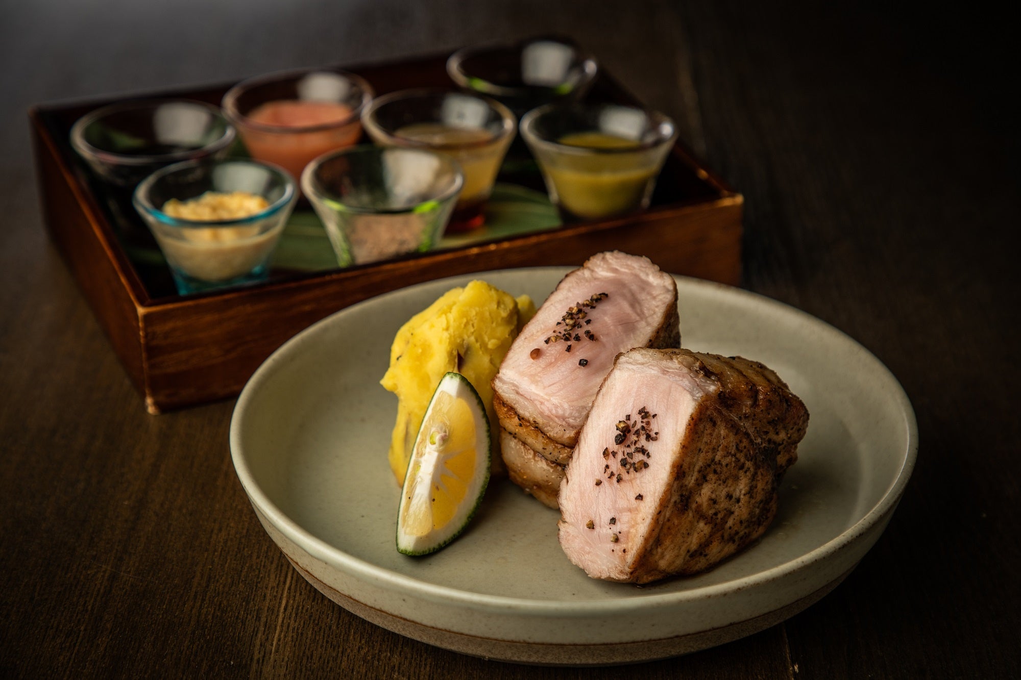 鹿児島で流通している黒豚の1%にも満たない生産量から “幻の豚 ”と呼ばれている「六白黒豚 」を丁寧にグリル 。九州各県の名産を使用した7つのソースで豚肉の旨味の七変化をお楽しみください。