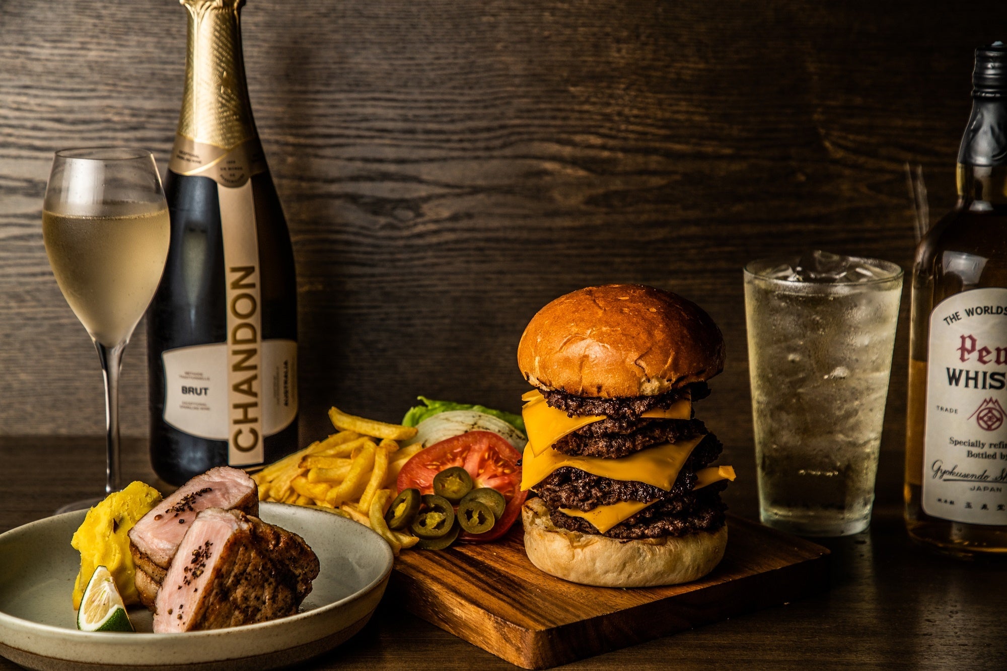 7周年を記念したアニバーサリーメニューは、産地こだわりの国産ミートを使用したガストロパブらしい料理がラインナップ。7周年ならではのインパクトを誇る「スマッシュパティの7段ハンバーガー」や“幻の豚 ”と呼ばれる六白黒豚をグリルした「鹿児島県産六白豚のグリル 九州地方7種の名産品ソース」、PUBの人気フード「Buffalo Chicken」など3種をご用意。お酒との相性も抜群の期間限定アニバ―サリーメニューを是非ご賞味ください。