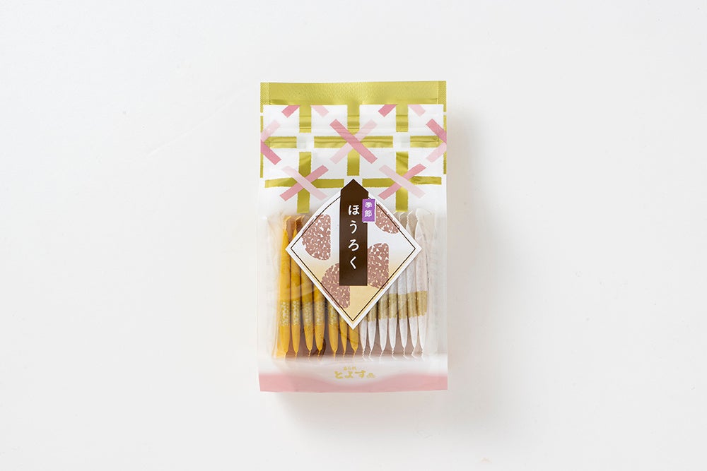 とよすの歴史を築いた“豊洲六郎”の名が由来の『ほうろく』は、とよすのこだわりと伝統を結晶にした自信作。『ほうろく』の特徴は、お米ひと粒ひと粒が感じられる独自の食感。昔ながらの製法“せいろ蒸し”でもち米を蒸しあげ、蒸しあがった熱いもち生地は、お米の粒を壊さないように手作業で丁寧に固めていくことで、その独自の食感を作り上げます。薄く焼き上げた『ほうろく』は、ひと粒ずつの食感と、カリっとした心地よい歯ごたえ、そしてもち米本来の素朴なおいしさを味わっていただけます。このたびは歴代『ほうろく』のフレーバーの中でも人気の高い、ごぼうが6年ぶりに復活。定番のしょうゆとのセットを、季節限定で販売いたします。
