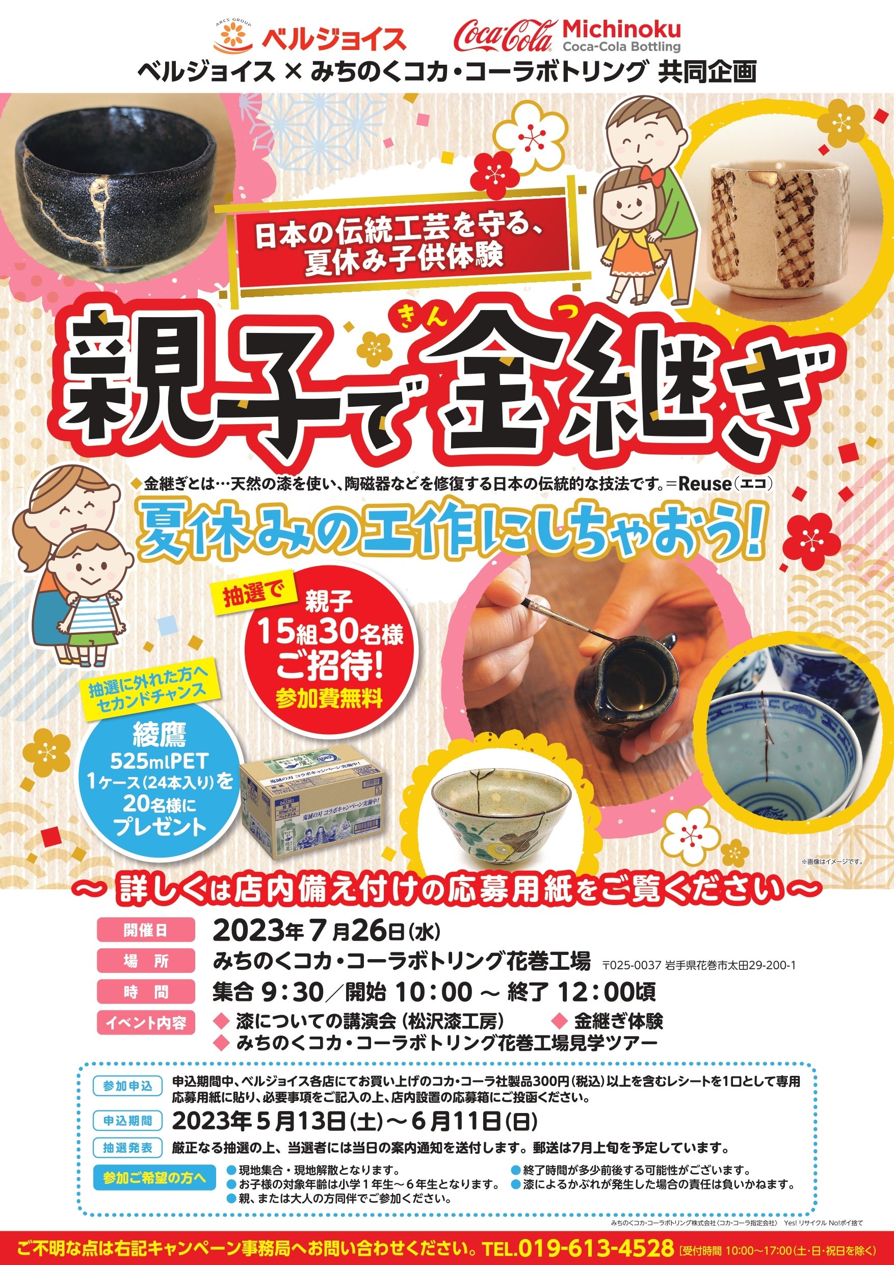 このイベントは、ベルジョイス各店でコカ・コーラ社製品をご購入されたお客様を応募対象として実施したキャンペーンにおいて、抽選で親子30名様を当社 花巻工場にご招待し、漆出荷量日本一を誇る岩手の伝統工芸を体験していただこうと、三社が協働で企画したものです。