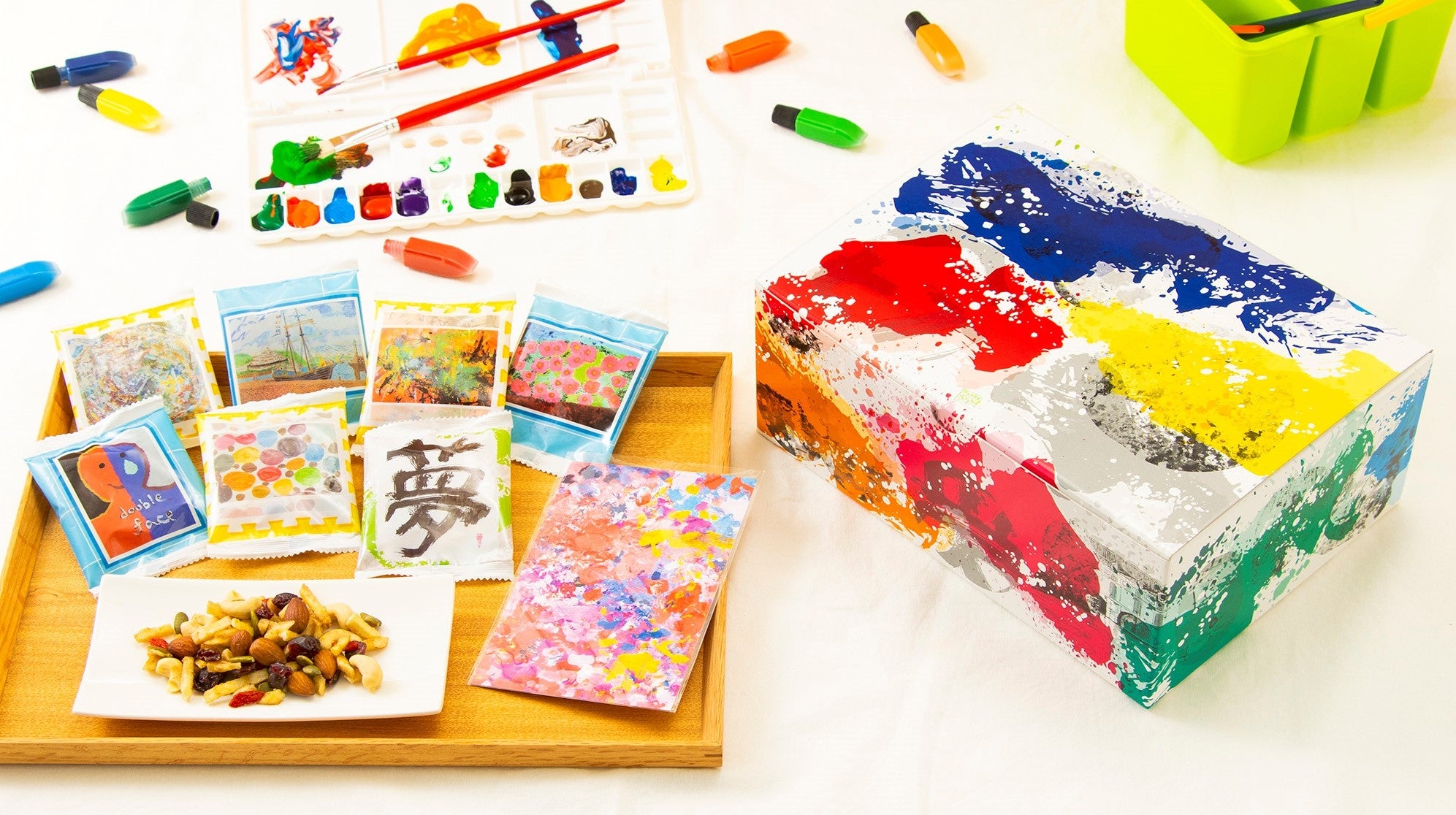 「ナッツ&フルーツ アートボックス」のパッケージデザインは、ノーサイドのアーティストの作品を基に、大阪シーリング印刷が化粧箱と包装フィルムを製造し、菓子の販売および卸売業のMDホールディングスが企画・発売する新商品です。