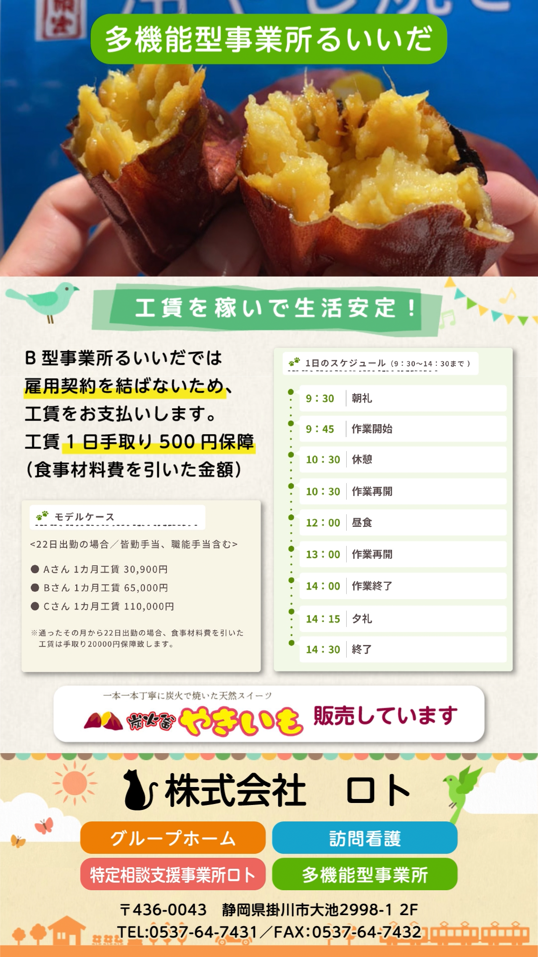 「焼き芋事業が忙しく、人手がのどから手が出るほど欲しいので、3周年を機に大々的に利用者を募集したいと思っています。チラシも工賃についてわかりやすく変更しました。幅広い年代の利用者の方が性別問わずいらっしゃるので誰でも作業に溶け込みやすいと思います。新しいチラシにも記載していますが能力によってはかなり稼げるのでA型作業所では不安だけど工賃が安いのはちょっという方にも合うと思います」