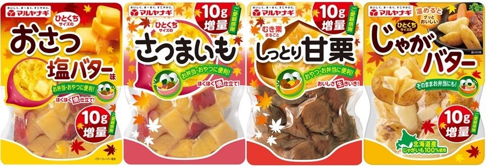 食事やお弁当の一品として一年を通じてお客様にご支持をいただいている「ひとくちサイズのおかず」シリーズは、さつまいもや栗が旬を迎える秋、特に多くのお客様にお買い求めいただいております。需要期でもあるこの時期に合わせ、数量限定にて10g増量及び秋限定パッケージで販売いたします。