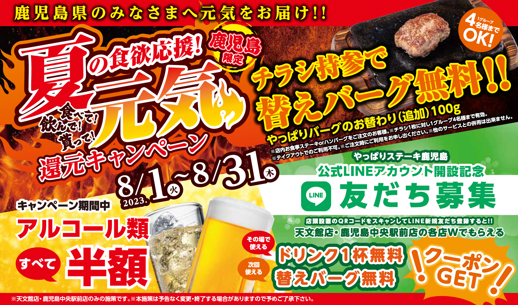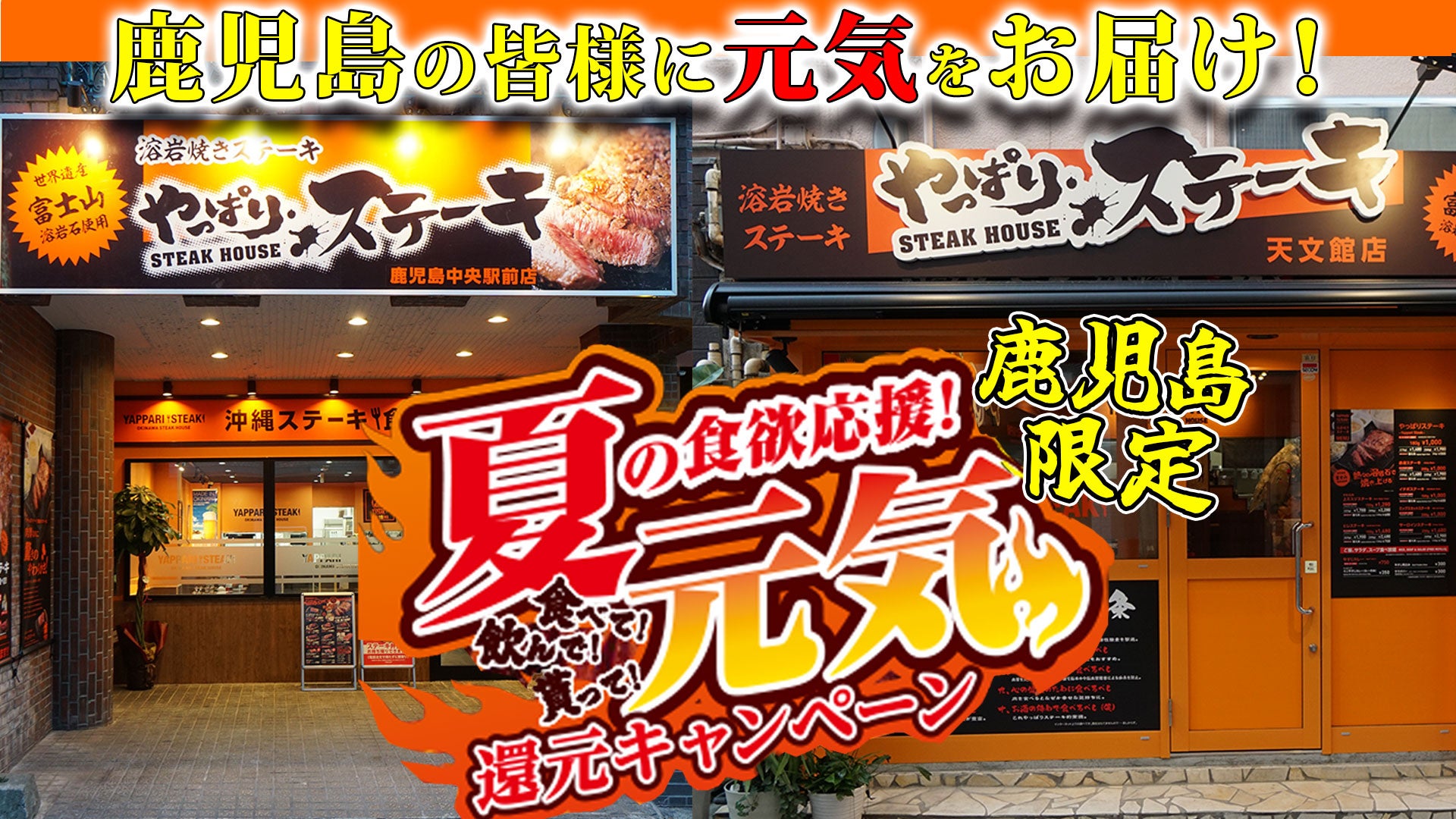 鹿児島県のやっぱりステーキ店舗「鹿児島中央駅前店」「天文館店」で超お得なキャンペーンを実施します。
