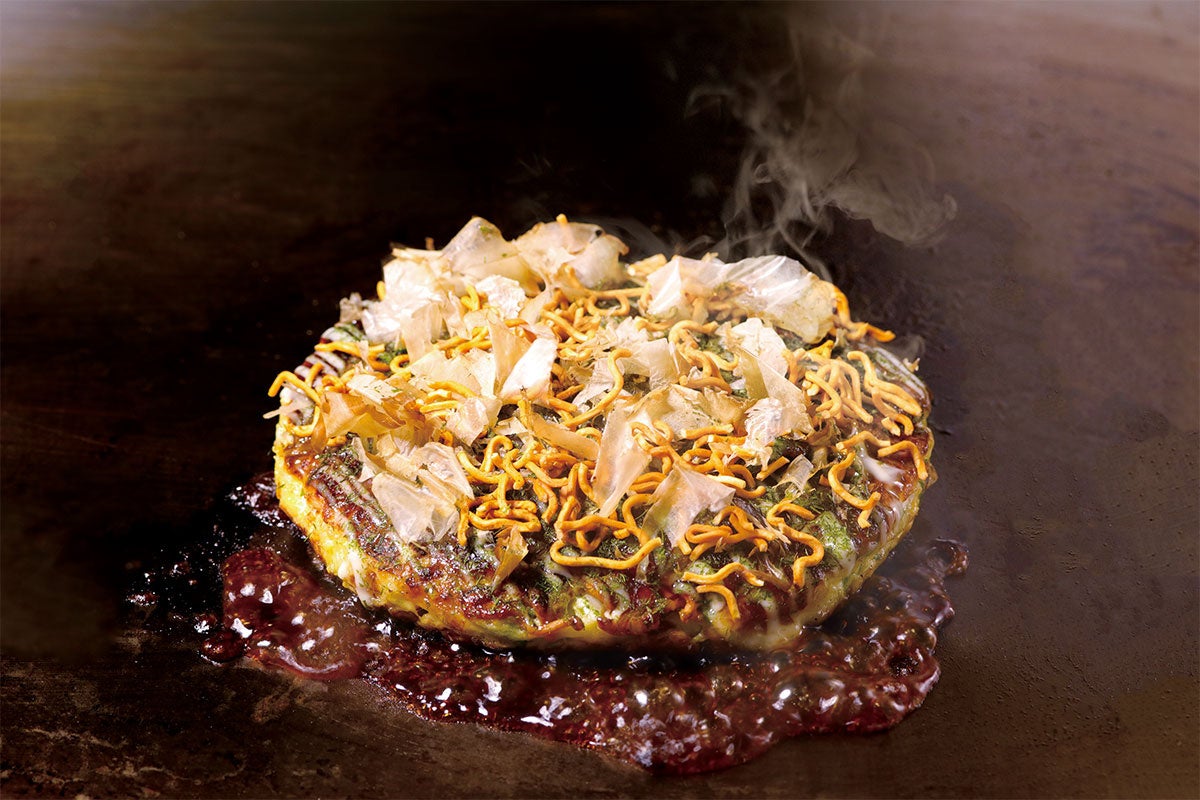 千房のお好み焼とベビースターのコラボメニュー。山芋をたっぷりと使用したふわふわ生地の「ふわとろ焼」にベビースターを張り付け香ばしく仕上がっております。さらに上からベビースターをふりかけ、ふわふわ、パリパリ食感のコントラストをお楽しみいただけます。中にチーズも入っており、「ふわっ」「トロッ」「パリッ」と様々な食感が楽しめます。