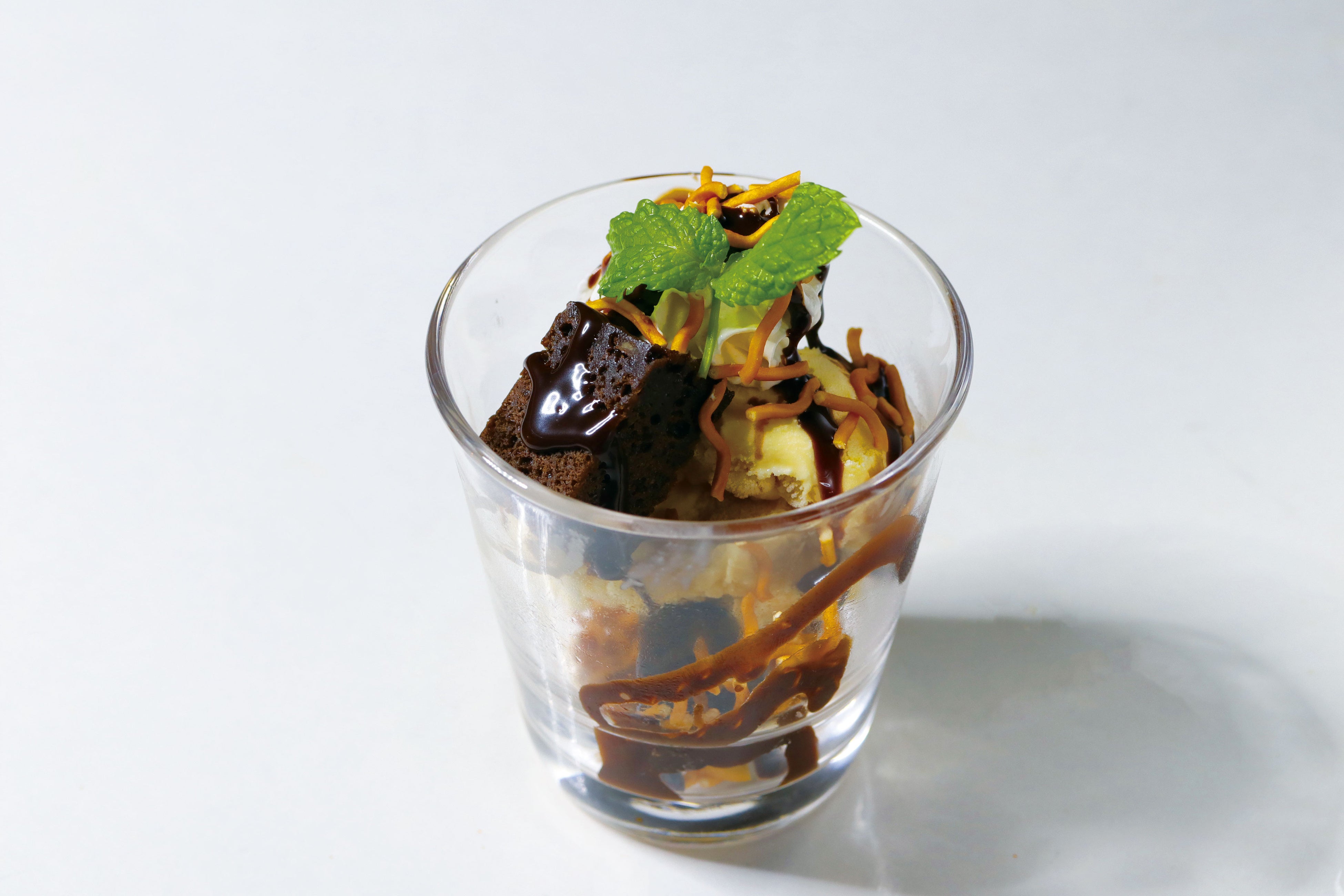 チョコレートパフェにベビースターをトッピングした甘しょっぱいショコラパフェ。