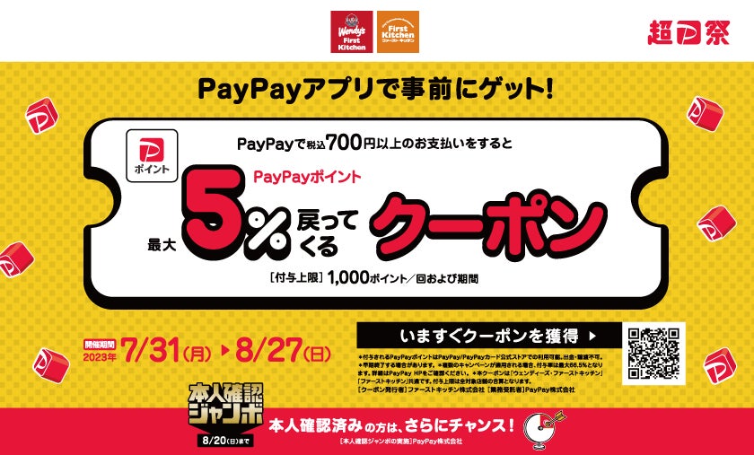 * 本クーポンはウェンディーズ・ファーストキッチン、ファーストキッチン共通です。付与上限は全対象店舗の合算となります。