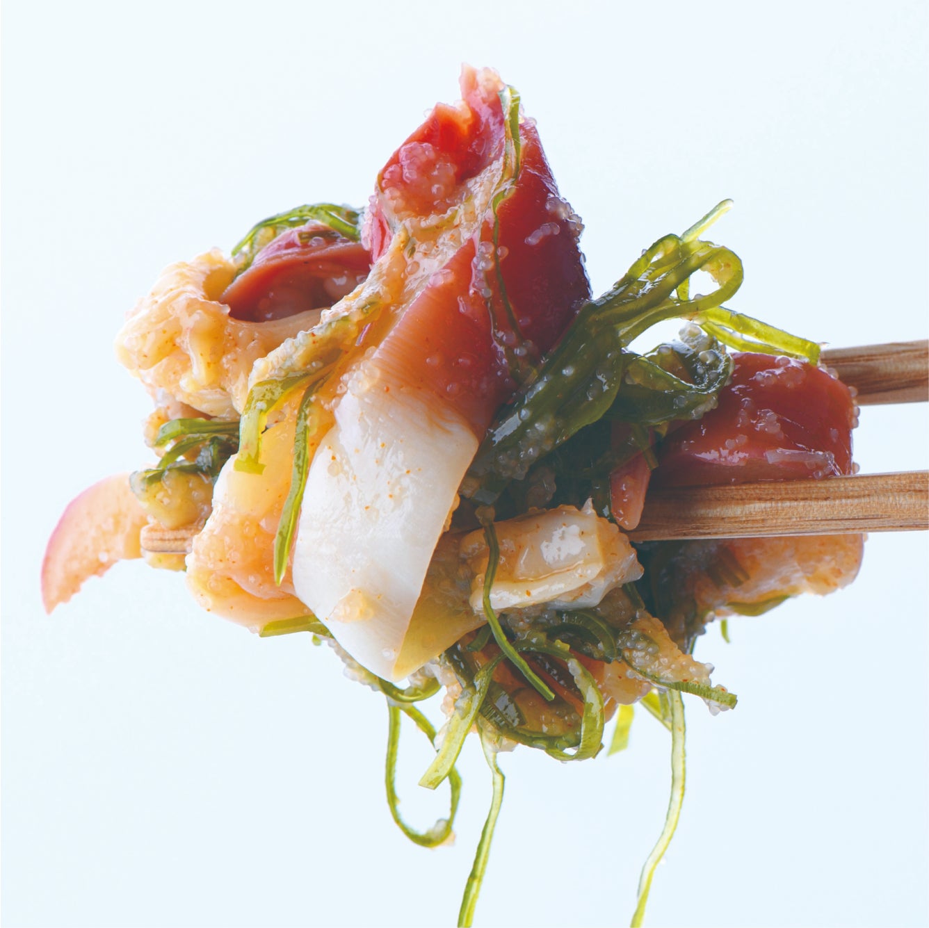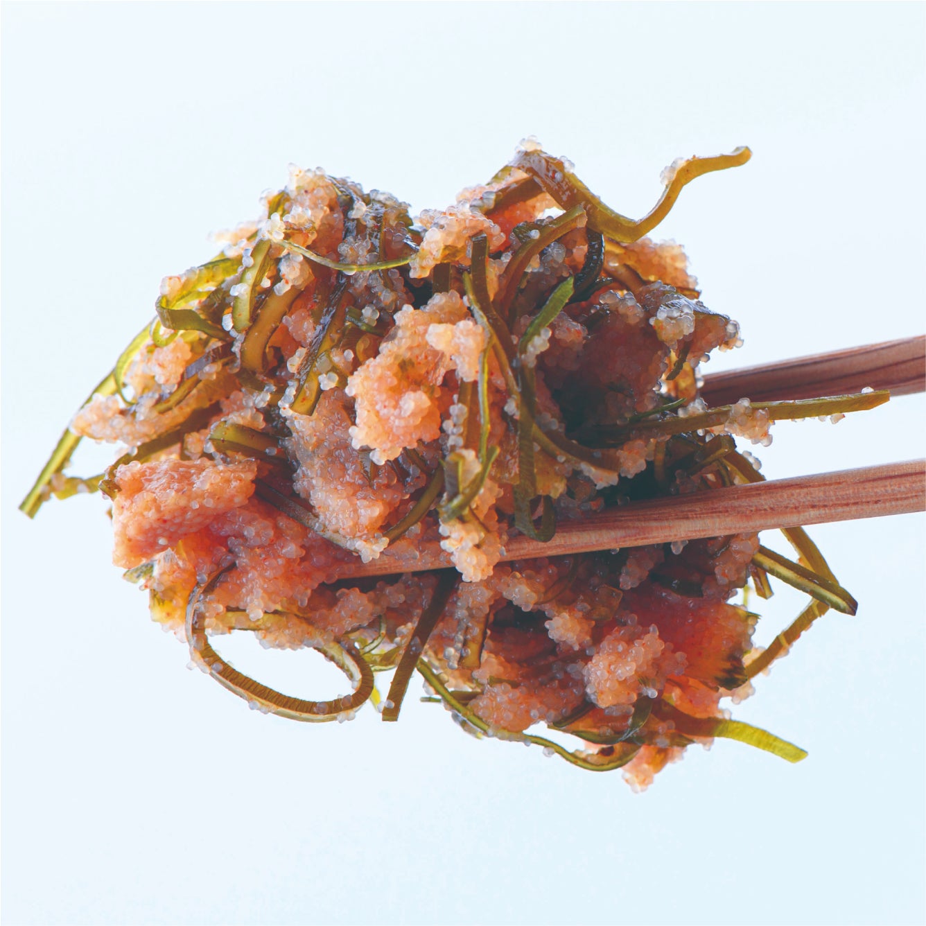三種類の昆布のうまみがめんたいこと濃厚にからみ合う、昆布が主役の一品です。