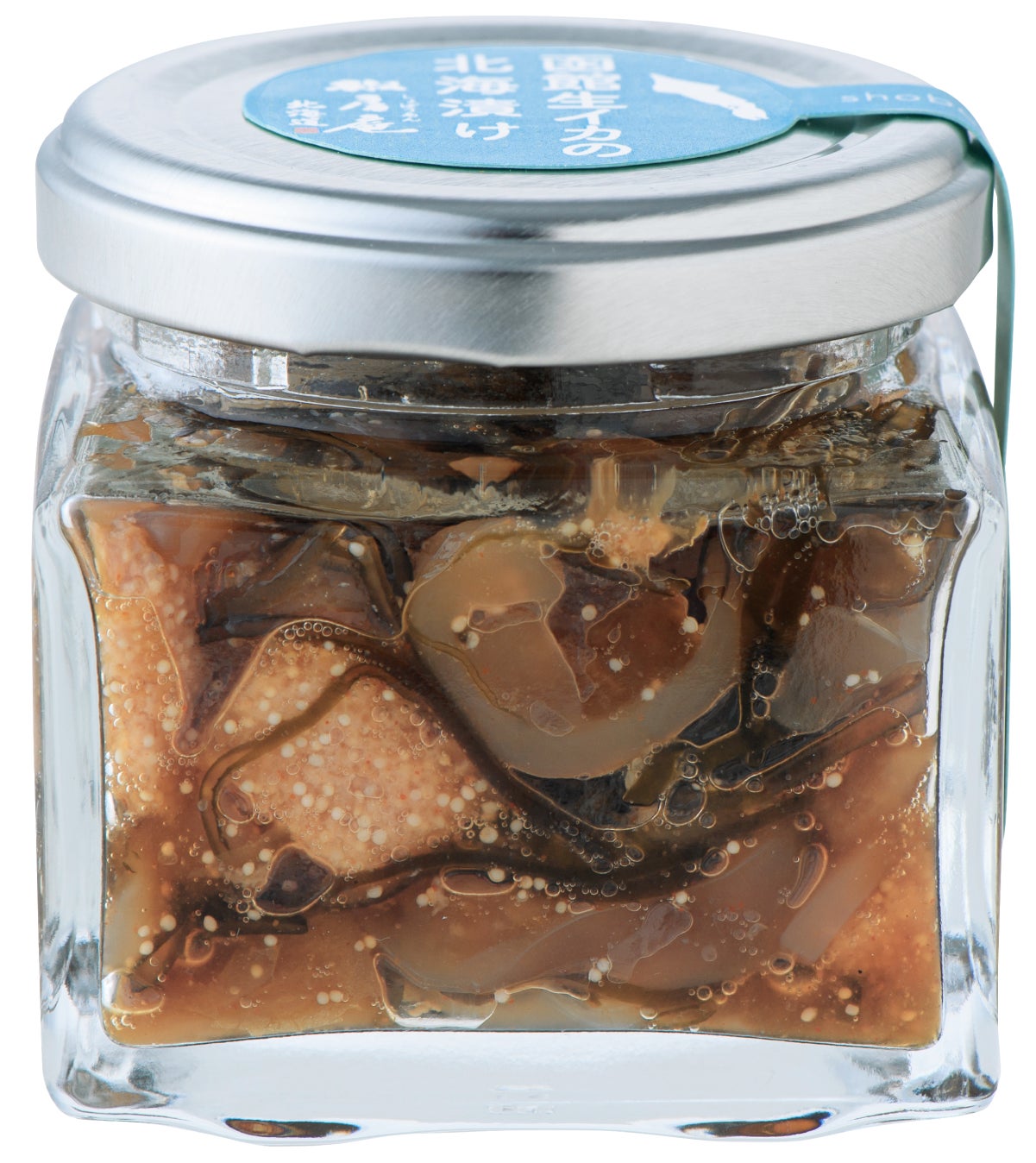 函館産のスルメイカを<生>のまま使用。やわらかくもっちりとした食感と甘みをお楽しみいただけます。イカの味を引き立たせるために厳選した三種類の昆布「猫足昆布」「がごめ昆布」「真昆布」に、さらに昆布だしめんたいこを合わせました。北海道の海のうまみが凝縮した椒房庵特製の「北海漬け」です。