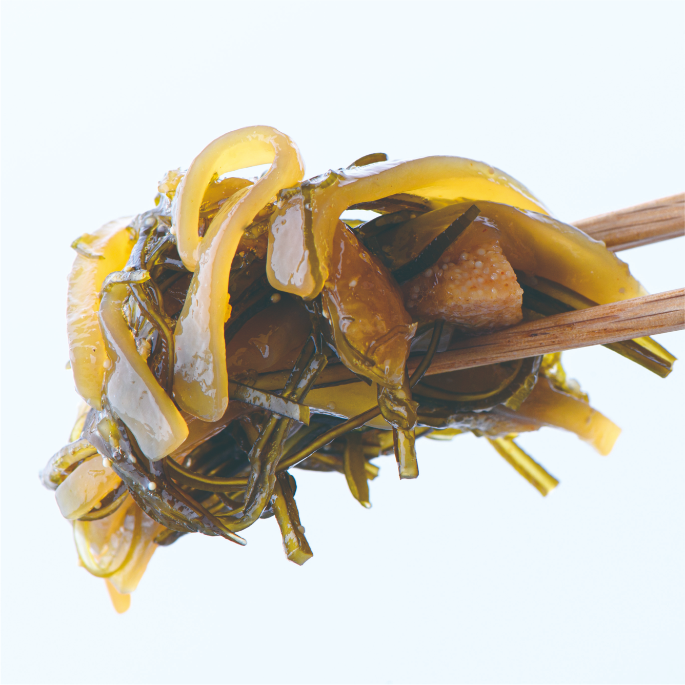 三種類の昆布のうまみがめんたいこと濃厚にからみ合う、昆布が主役の一品です。
