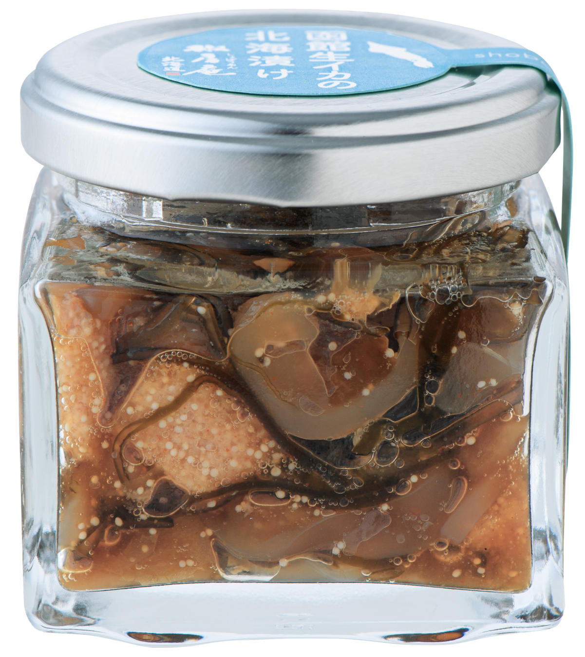 函館産のスルメイカを<生>のまま使用。やわらかくもっちりとした食感と甘みをお楽しみいただけます。イカの味を引き立たせるために厳選した三種類の昆布「猫足昆布」「がごめ昆布」「真昆布」に、さらに昆布だしめんたいこを合わせました。北海道の海のうまみが凝縮した椒房庵特製の「北海漬け」です。