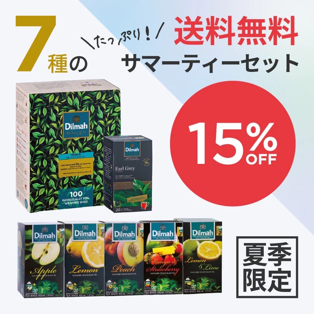 スリランカ紅茶ブランド「ディルマ」だから楽しめる茶葉のクリアな味わいと華やかなフレーバーをたっぷりと楽しめる商品が詰め合わさったものとなっており、この夏爽やかな味わいをたっぷりお楽しみ頂けます。