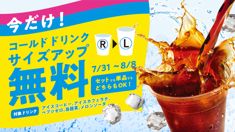 猛暑が続く今年の夏に、冷たいドリンクでしっかり水分補給していただけるよう、ドリンクLサイズアップ無料のキャンペーンを9日間実施いたします。対象商品である「アイスコーヒー」「アイスカフェラテ」「ペプシゼロ」「烏龍茶」「メロンソーダ」の5種類のコールドドリンクが、期間内はセット注文でも単品注文でも、無料でLサイズアップが可能になります。
