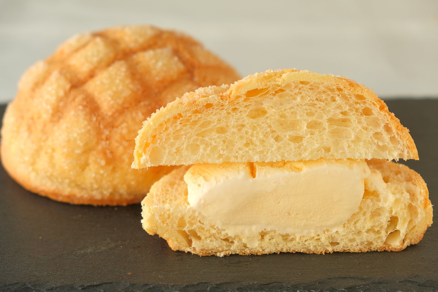 とろけるアイスがふんわりパン生地に染み込んでおいしい”アイスメロンパン”